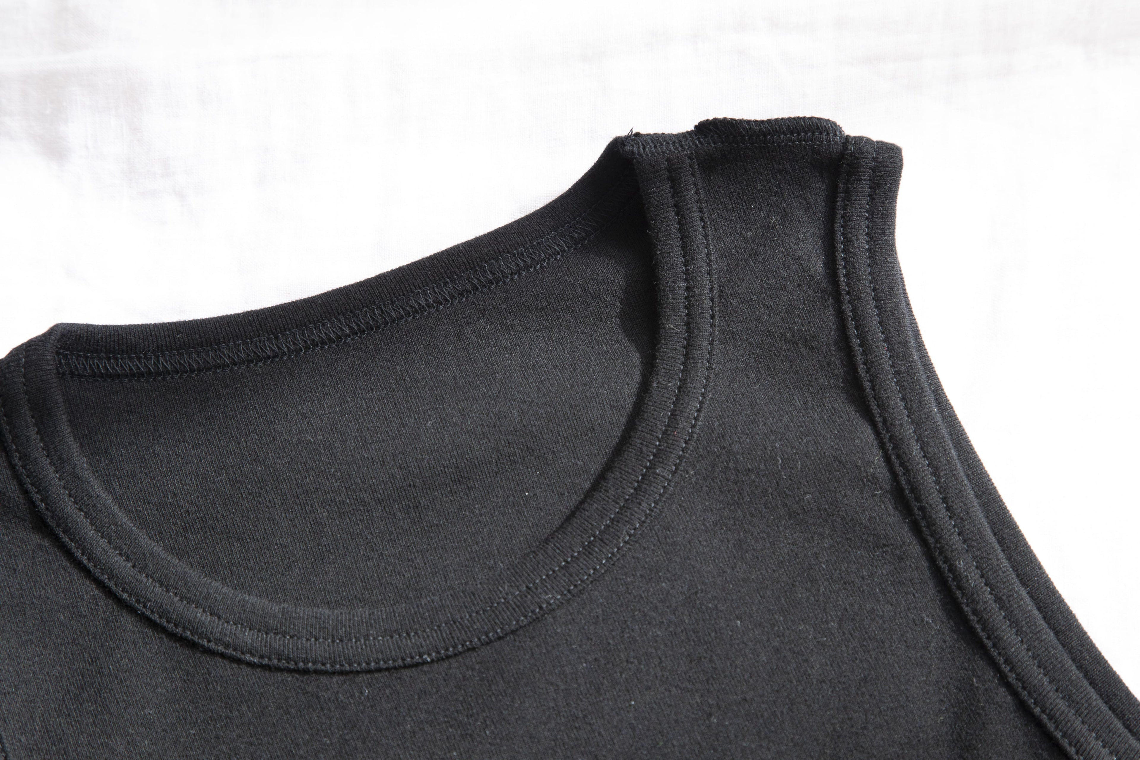肩と脇の縫い目、さらに洗濯ラベルも外側に配して、細部まで肌触りにこだわっています。